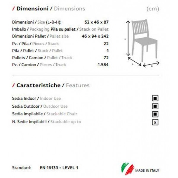 SEDIA PER USO INTERNO ED ESTERNO La sedia Minerva è molto pratica da maneggiare perché leggera. La sua caratteristica è lo schienale creato con stecche verticali sagomate che la rendono una sedia particolarmente imponente e robusta. Affascinante per le sue linee, si adatta perfettamente agli ambienti interni e professionali.